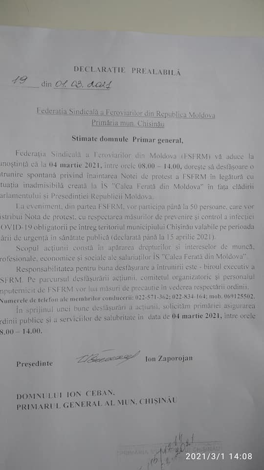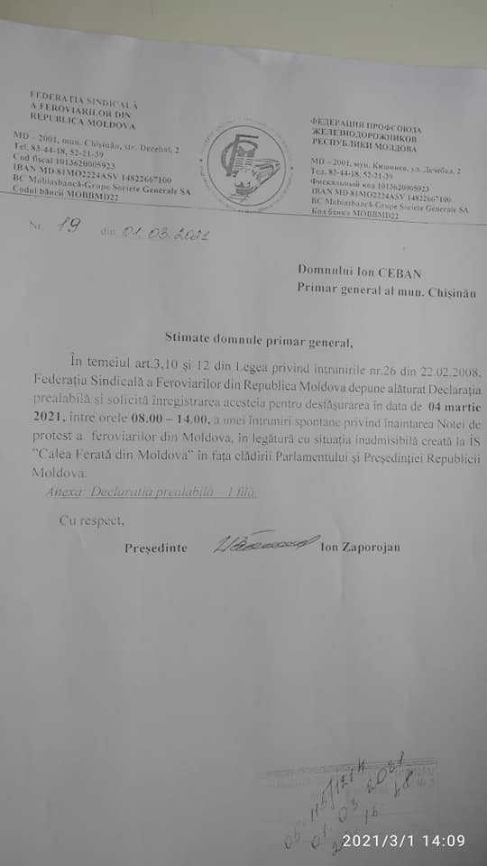 В Кишиневе 4 марта железнодорожники проведут акцию протеста перед зданием парламента и администрации президента. Профсоюзная федерация железнодорожников Молдовы 1 марта направила мэрии Кишинева оповещение о проведении акции протеста в связи с создавшейся ситуации на предприятии «Железная дорога Молдовы» (ЖДМ).