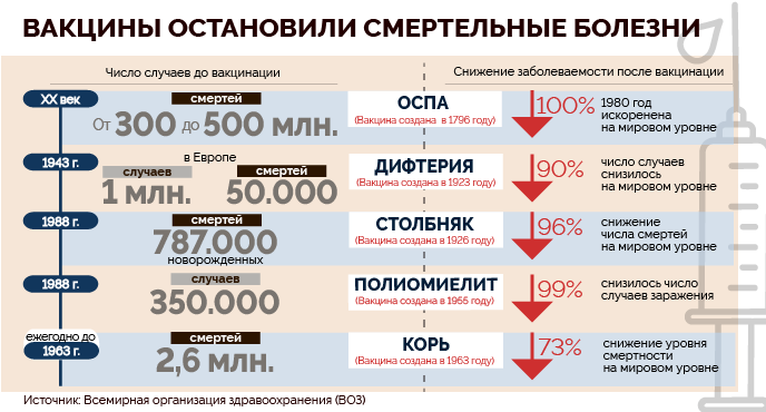 Согласно Всемирной организации здравоохранения (ВОЗ), оспа – первое инфекционное заболевание человека, которое было искоренено посредством вакцинации. Эпидемии оспы только в XX веке унесли от 300 до 500 миллионов жизней во всем мире, пока не были остановлены. По данным Центра по контролю и профилактике заболеваний США (CDC), в среднем 3 из 10 человек, заболевших оспой, умерли. У перенесших болезнь на всю жизнь оставались глубокие рубцы и зачастую они теряли зрение. Вакцина против оспы, созданная в 1796 году, была первой успешной вакциной. С 1967 года ВОЗ начала массовую вакцинацию на мировом уровне, а спустя 10 лет, в 1977 году, в Сомали был диагностирован последний случай заболевания оспой. Благодаря вакцинации, 8 мая 1980 года ВОЗ официально объявила, что оспа успешно искоренена на мировом уровне.