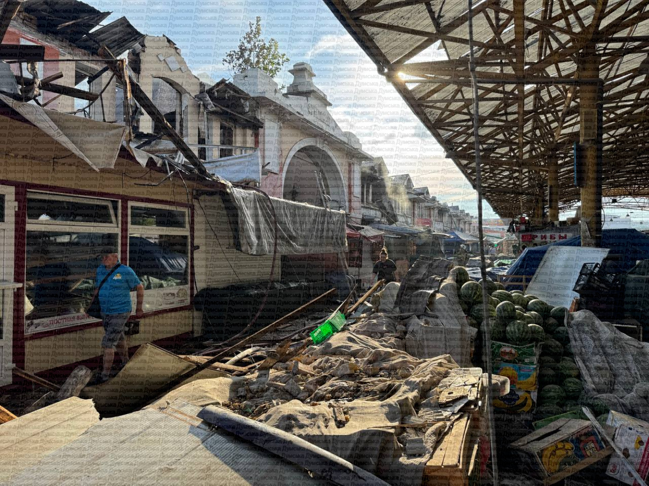 В результате ночной атаки беспилотников по Одессе серьезно пострадал один из символов города — рынок Привоз. На его территории вспыхнул пожар, повреждены исторические павильоны, среди торговых рядов лежат обломки дронов. Несмотря на разрушения, рынок продолжает работу, продавцы спасают уцелевший товар.