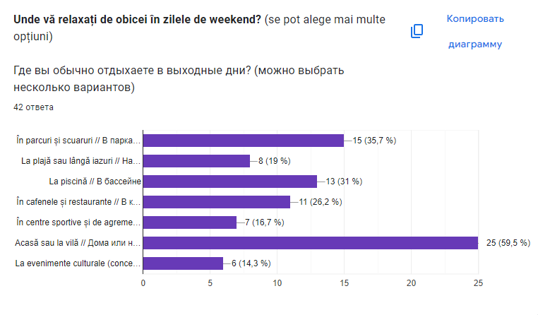 По результатам опроса, большинство респондентов — 59,5% — проводят выходные дома или на даче. На втором месте по популярности оказались прогулки в парках и скверах — этот вариант выбрали 35,5% опрошенных. Около 30% предпочитают отдых в бассейне, 26% выбирают кафе и рестораны, почти 20% отправляются на пляж или к водоёмам, а 16,5% посещают спортивные и развлекательные центры. Лишь 14,5% отметили участие в культурных мероприятиях, таких как концерты или выставки.