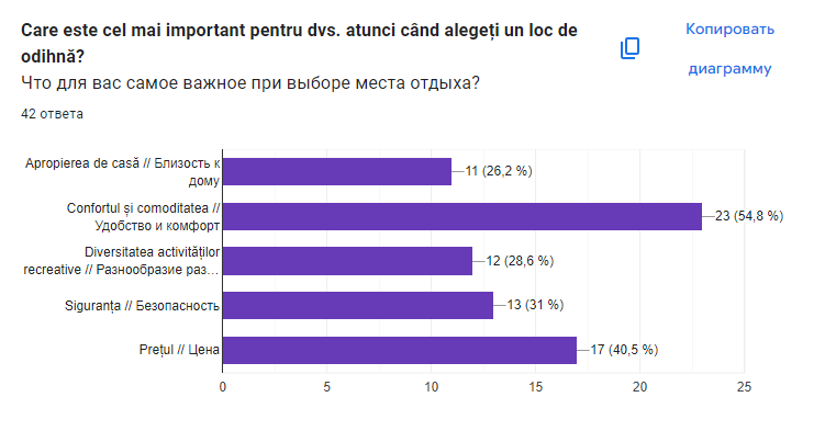 При выборе места отдыха наибольшее значение для участников опроса имеет удобство и комфорт — этот фактор оказался важным для почти 55% респондентов. Цена занимает второе место — её указали 40,5% участников. Безопасность оказалась приоритетной для 31%, разнообразие развлечений — для 28,5%, а близость к дому — для 26%.