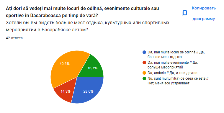 Таким образом, опрос показывает: несмотря на любовь к домашнему отдыху, жители Басарабяски готовы проводить больше времени вне дома — если в городе появятся доступные, уютные и современные места для летнего досуга.