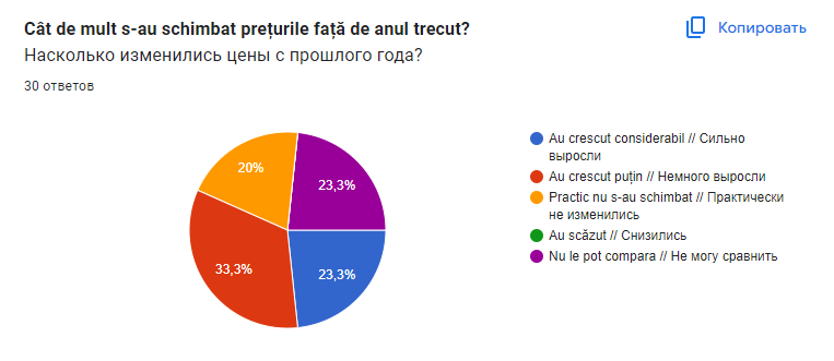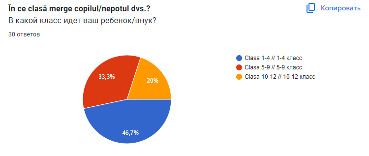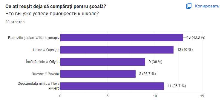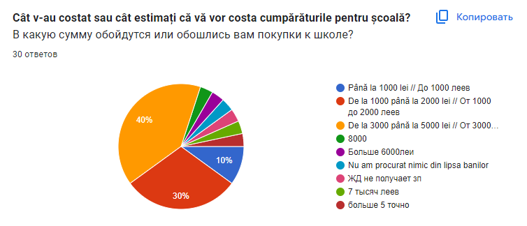 40% участников опроса потратили на покупки к школе от 3 до 5 тысяч леев на одного ребенка. Еще 30% ответили, что общая сумма затрат составила от 1 до 2 тысяч леев. Остальные 10% написали, что школьник в этом году обошелся им дешевле, чем в 1000 леев. Были и те, кто потратил на покупки 7 или 8 тысяч леев. Также некоторые опрошенные указали, что из-за нехватки средств что-то купить им очень сложно.
