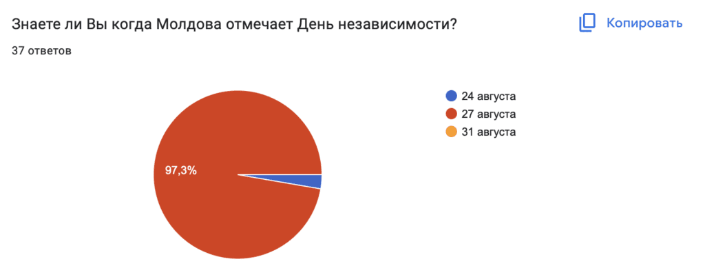 Согласно его данным, более 97% респондентов знают, что День независимости Молдовы отмечается 27 августа. Около 3% ответили, что наша страна отмечает День независимости 24 августа.