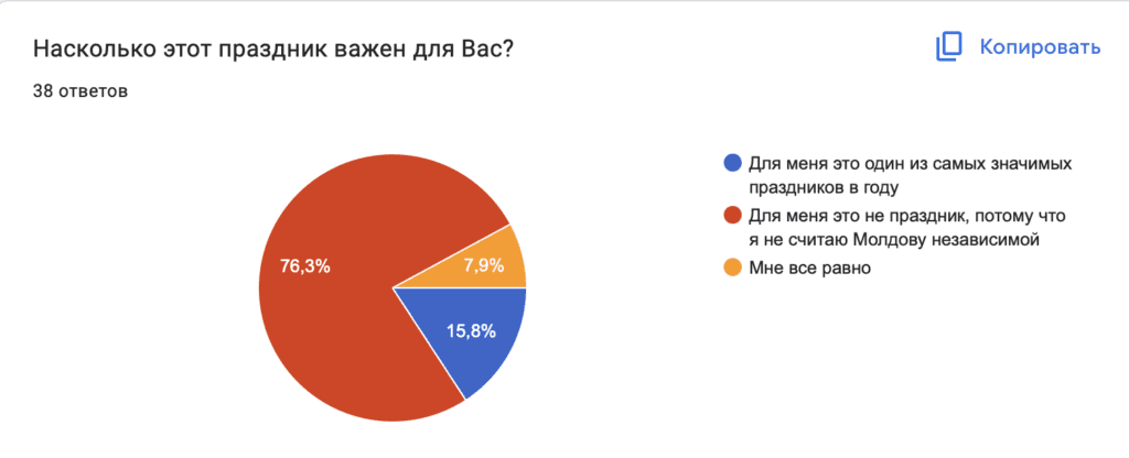 Чуть больше 76% опрошенных не отмечают этот праздник, так как не считают Молдову независимой. Для 16% День независимости — один из самых значимых праздников в году. Еще 8% все равно.