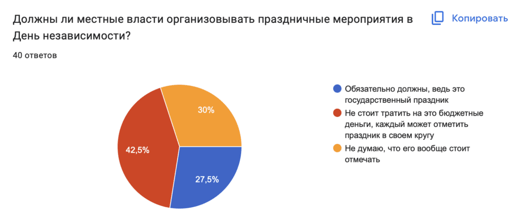 По мнению 43% респондентов, местные власти не должны тратить бюджетные деньги на организацию мероприятий ко Дню независимости, так как каждый может отметить его в своем кругу. Еще 30% считают, что этот праздник вообще не стоит отмечать. Только 27% участников опроса ответили, что День независимости нужно обязательно праздновать, так как это государственный праздник.