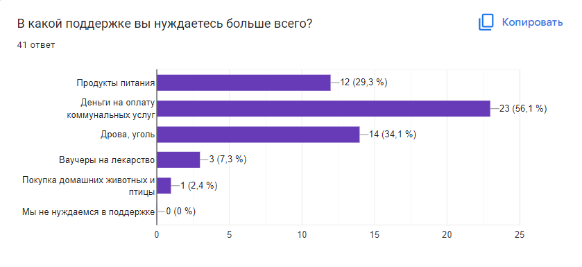 56% ответили, что наиболее актуальной поддержкой для них являются деньги на оплату коммунальных услуг, 34% считают, что для них хорошей помощью были бы уголь и дрова, еще 29% приняли бы в помощь продукты питания.