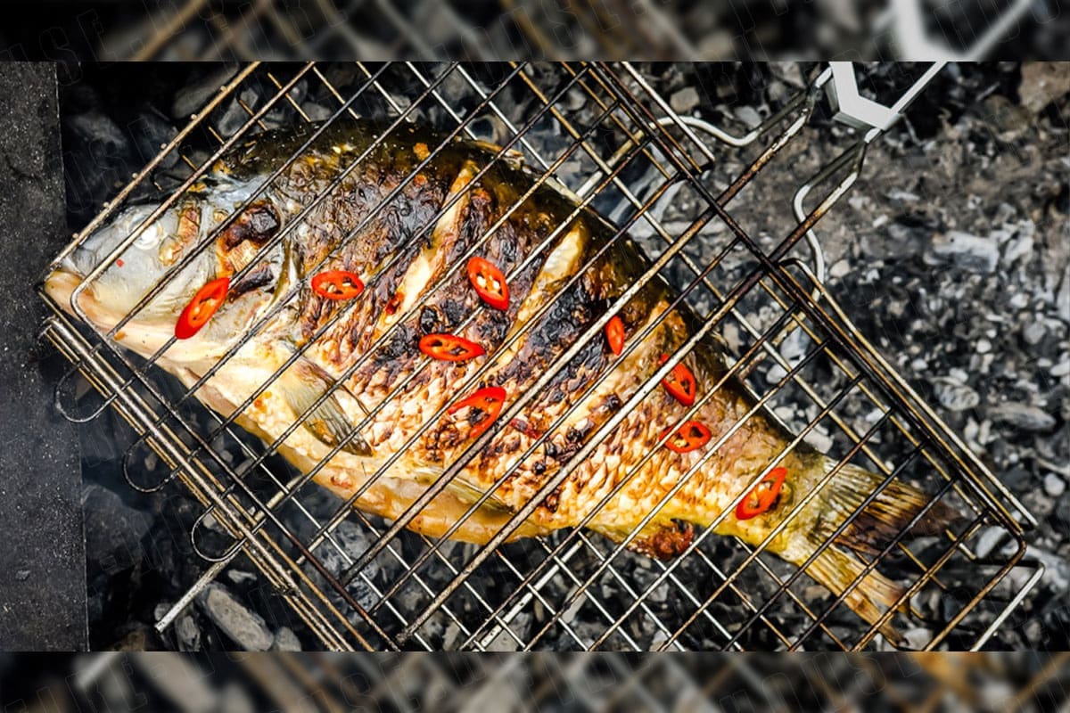 Готовьте рыбу на решётке около 15 минут, время зависит от размера карпа. Иногда переворачивайте, приподнимая решётку и смазывая остатками сметанной смеси.
