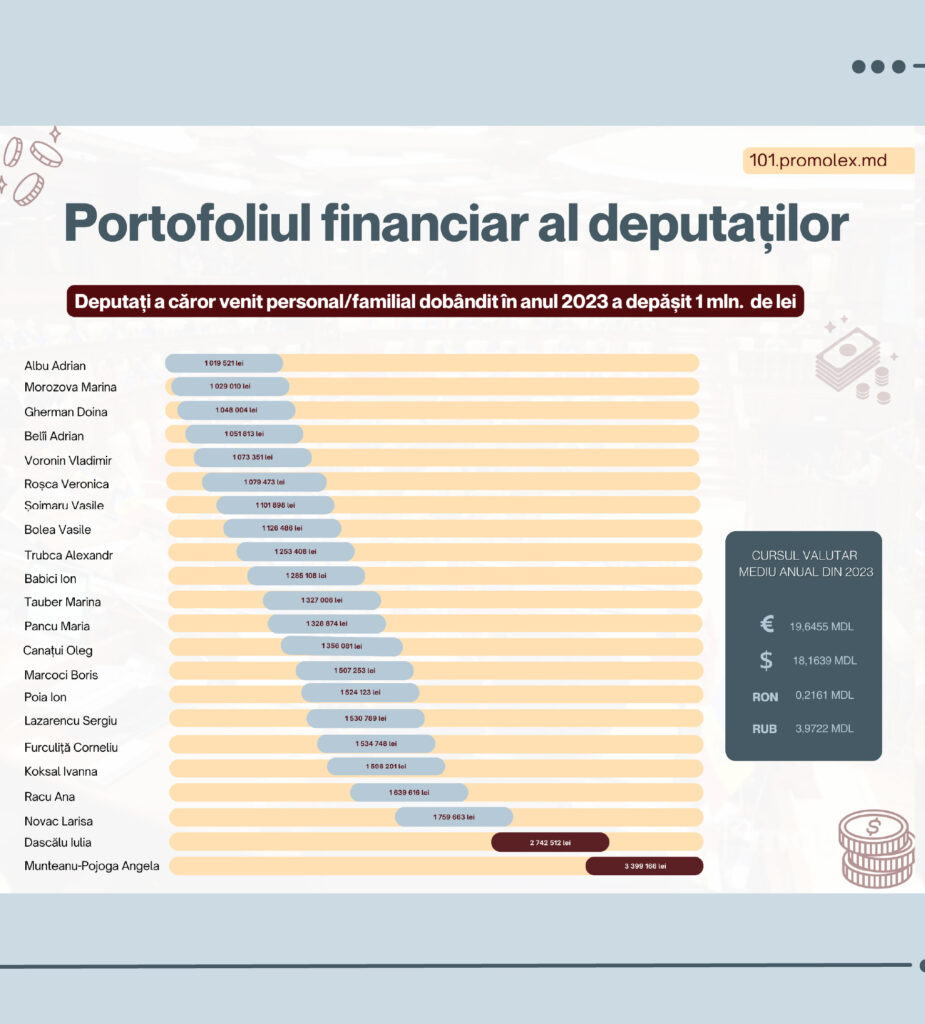 22 депутата парламента Молдовы задекларировали доходы за 2023 год на общую сумму свыше 1 миллиона леев. 9 депутатов указали также долги с общей суммой более 1 млн леев. Так, неправительственная организация Promo-LEX опубликовала рейтинг самых богатых и самых крупных должников среди депутатов Молдовы.