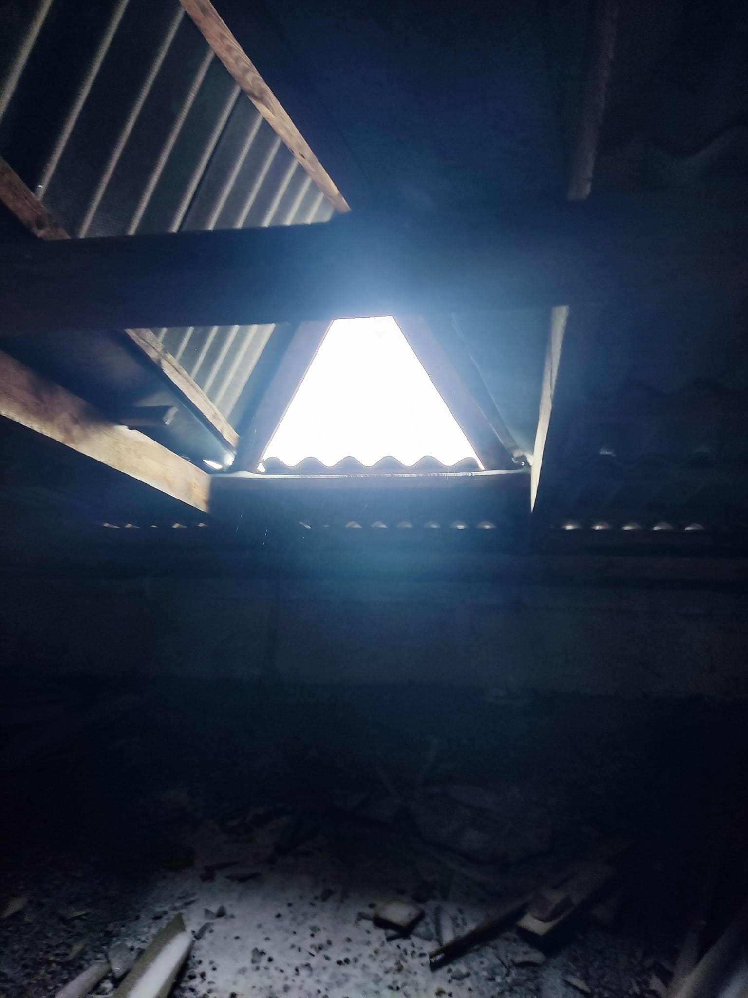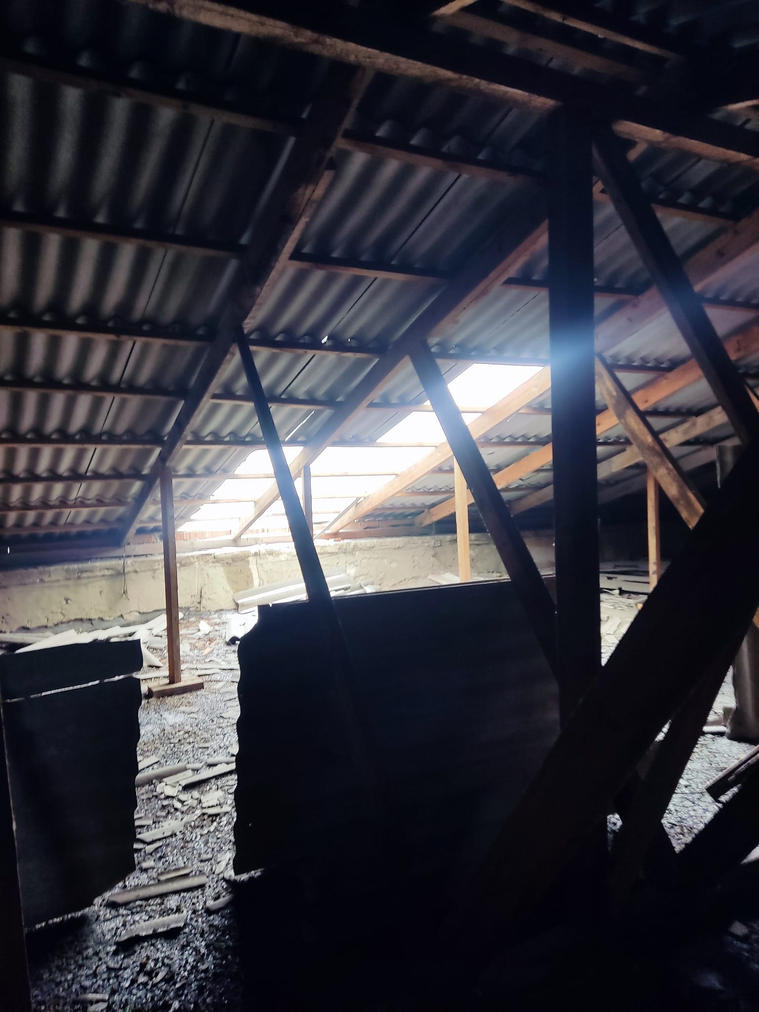 “Вышел к лестничной площадке и обнаружил что с крыши течёт вода: с 5 до 1 этажа. Открыл дверь к чердаку и залез на крышу посмотреть, что случилось. Там я обнаружил, что крыша в ужасном состоянии, шифер отсутствует во многих местах”.