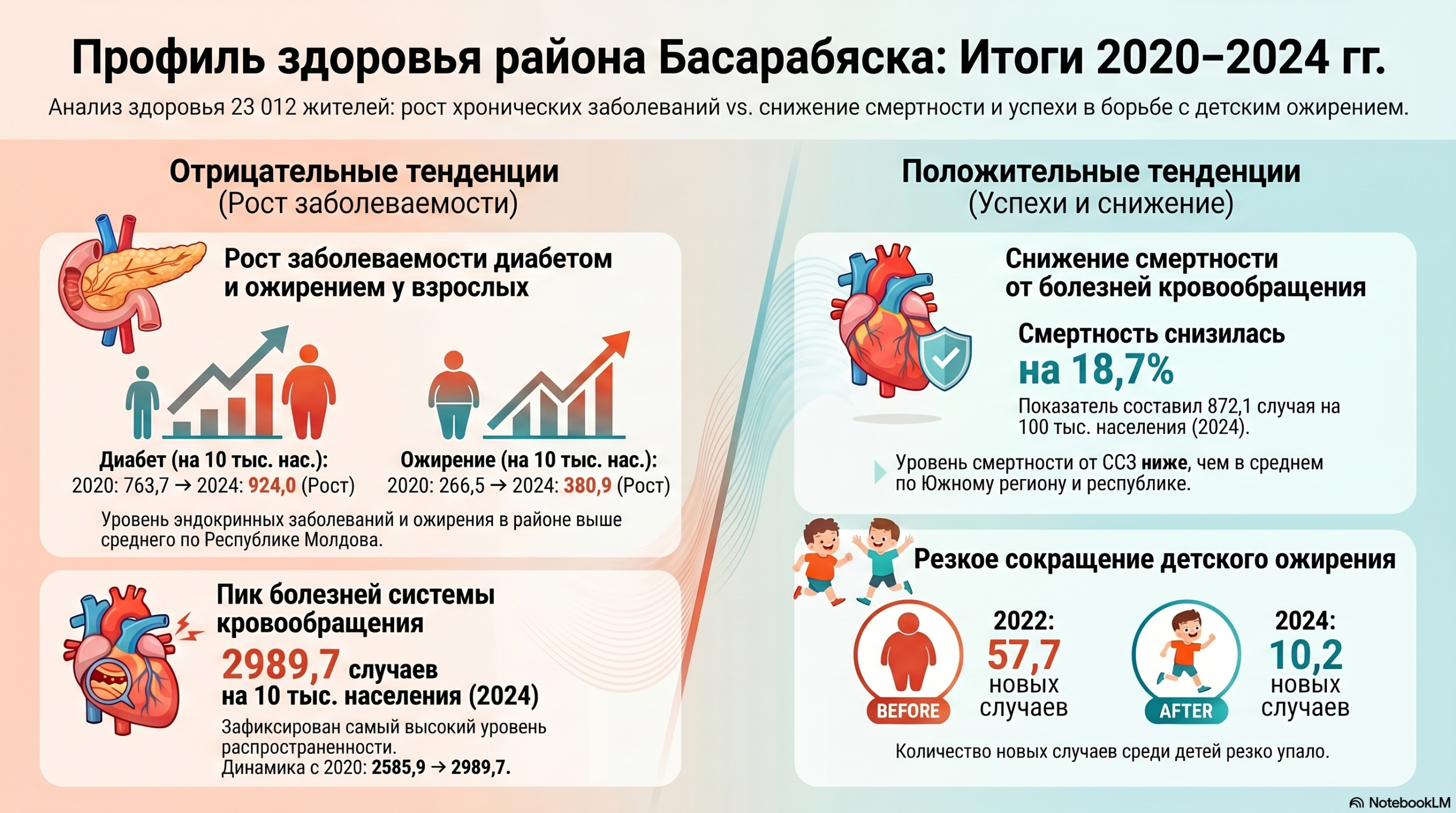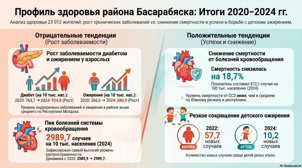 В районе Басарабяска за последние годы увеличилось число заболеваний системы кровообращения, диабета и ожирения среди взрослых, при этом смертность от этих болезней и показатели детского ожирения снижаются. Такие данные содержатся в Профиле здоровья района за 2020–2024 годы. Их представили и обсудили 24 апреля 2026 года в ходе рабочего ателье, посвященного мерам по профилактике неинфекционных заболеваний в рамках проекта «Viață Sănătoasă».