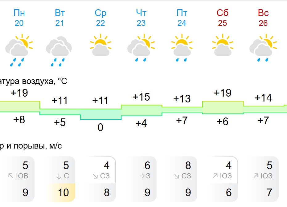 Неделя стартует в понедельник, 20 апреля, с тёплой и влажной погоды. Днём температура воздуха поднимется до +19°C, ночью — около +8°C. Ожидаются дожди, местами умеренные, при слабом юго-восточном ветре.