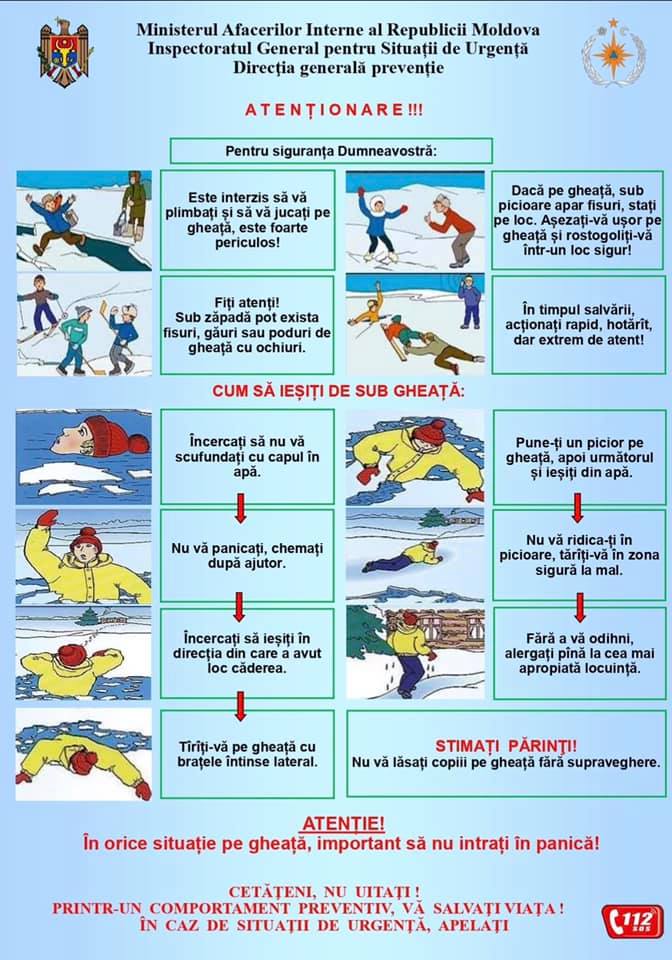 Gheaţa va fi fragilă şi îmbinată cu apă, ieşirea pe ea va prezenta pericol existînd riscul prăbuşirii sub gheaţă. În acest context, atenţionăm şi familiarizăm toţi cetăţenii cu regulile de comportare pe gheaţă şi măsurile de securitate în această perioadă, în scopul prevenirii şi evitării eventualelor accidente.