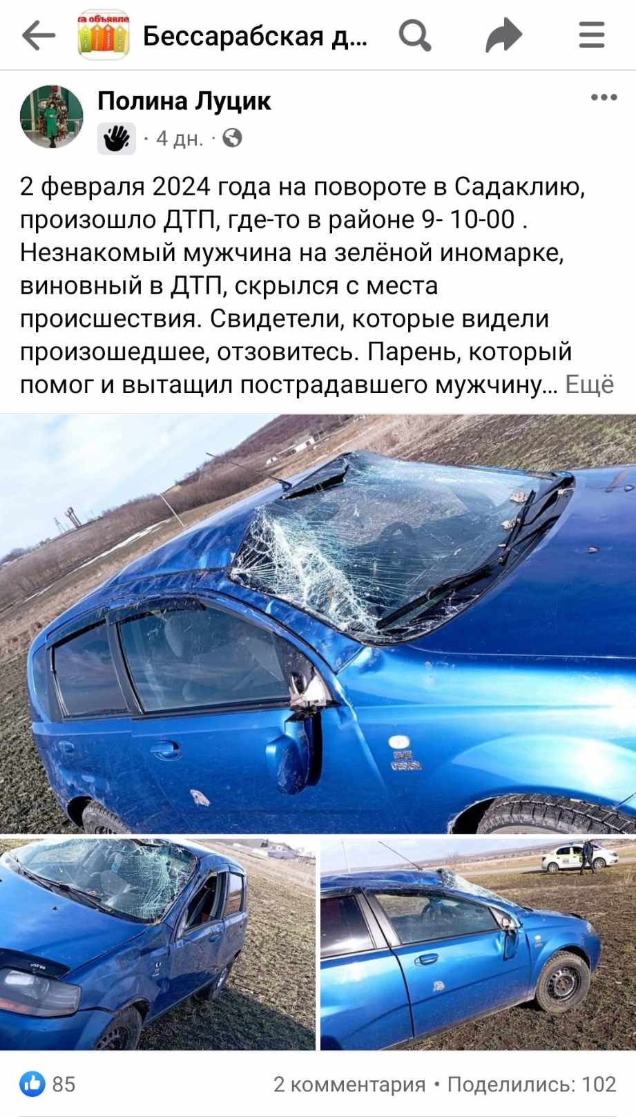 Recent, pe un grup de Facebook a apărut un anunț în care se informează despre un accident, care a avut loc pe data de 2 februarie, la intersecția spre s. Sadaclia. Jurnaliștii BAStv, au contactat Inspectoratul de Poliție (IP) Basarabeasca pentru a afla mai multe detalii.