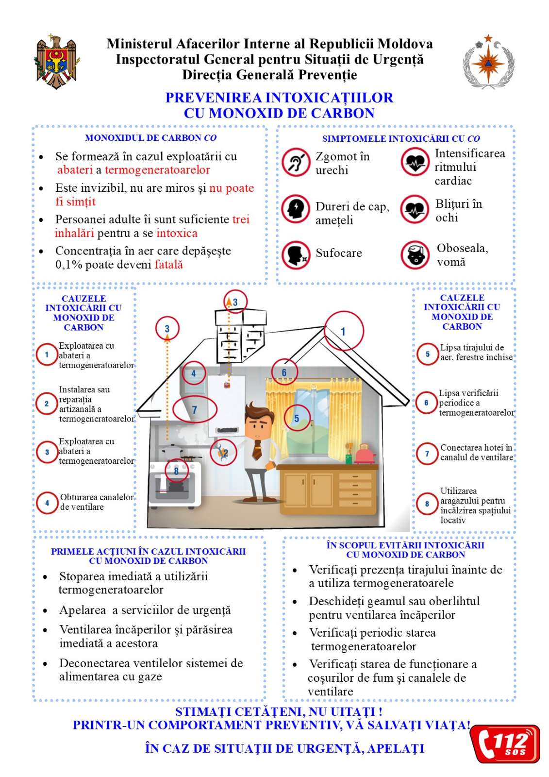 Totodată, în vederea evitării intoxicațiilor cu monoxid de carbon, oamenii sunt rugați să nu obtureze canalele de ventilare, să nu suprasolicite sobele care funcționează pe combustibil solid, dar și să nu păstreze mobilier sau haine în apropierea sursei de încălzit. Pe timp de noapte, dar și la plecarea din locuință, să stingeți focul din sobă.