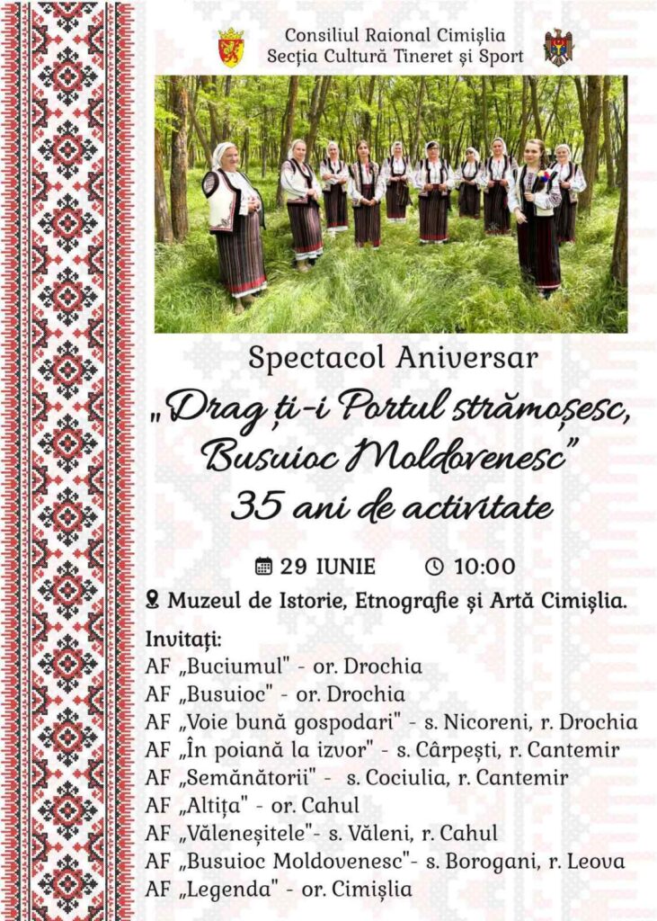 Evenimentul va începe la ora 10:00 și va aduce pe scena Muzeului din orașul Cimișlia o selecție impresionantă de ansambluri folclorice din întreaga țară. Printre invitați se numără ansamblurile „Buciumul”, „Busuioc” și „Voie bună gospodari” din raionul Drochia, „În poiană la izvor” și „Semănătorii” din raionul Cantemir, „Alțița” și „Văleneșițele” din raionul Cahul, „Busuioc Moldovenesc” din raionul Leova, precum și colectivele locale „Legenda” și, bineînțeles, ansamblul „Busuioc Moldovenesc”.