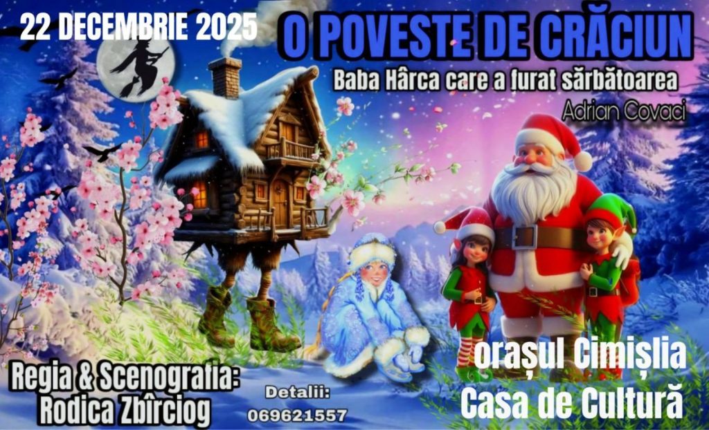 Locuitorii orașului Cimișlia, de la mic la mare, sunt invitați la un spectacol de iarnă dedicat întregii familii. Trupa Teatrului „B.P. Hasdeu” din Cahul va aduce pe scena Casei de Cultură piesa „O poveste de Crăciun: Baba Hârca care a furat sărbătoarea”, oferind publicului o experiență plină de emoție și farmec.