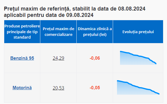 Prețul benzinei și al motorinei scade ușor, mâine, 9 august, potrivit cifrelor afișate de Agenția Națională pentru Reglementări în Energetică.