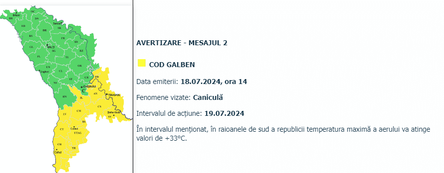 Pentru 19 iulie, meteorologii au emis un cod galben de caniculă pentru raioanele din sudul țării. Avertizarea va fi valabilă pe parcursul întregii zile.