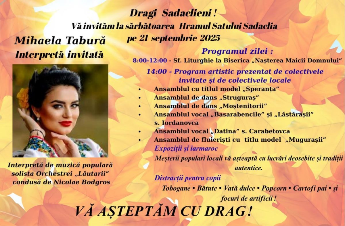 Duminică, 21 septembrie 2025, sadaclienii celebrează hramul Bisericii „Nașterea Maicii Domnului”, ocrotitoarea comunității locale. Ziua va începe cu oficierea slujbei religioase și va continua cu un program artistic de excepție, iarmaroc și expoziții de artizanat, activități pentru copii și, la final, un spectacol cu focuri de artificii.
