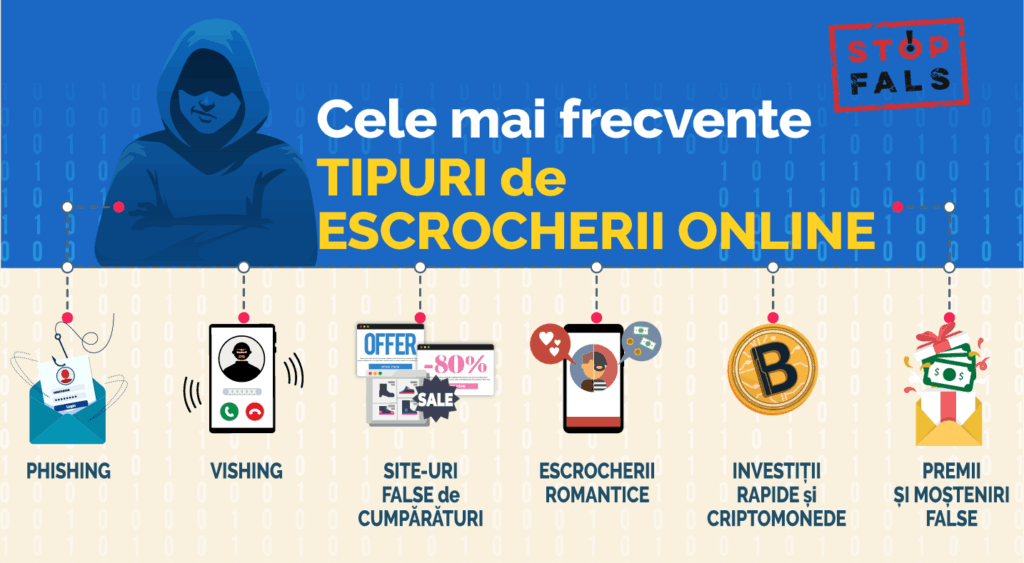 Conform informațiilor furnizate de Inspectoratul General al Poliției și experți în securitate cibernetică, cele mai frecvente tipuri de escrocherii digitale întâlnite sunt phishing, vishing, smishing, escrocherii pe site-uri de anunțuri, fraude de tip „investiții/trading”, dar și escrocherii romantice, cu moșteniri sau premii false.