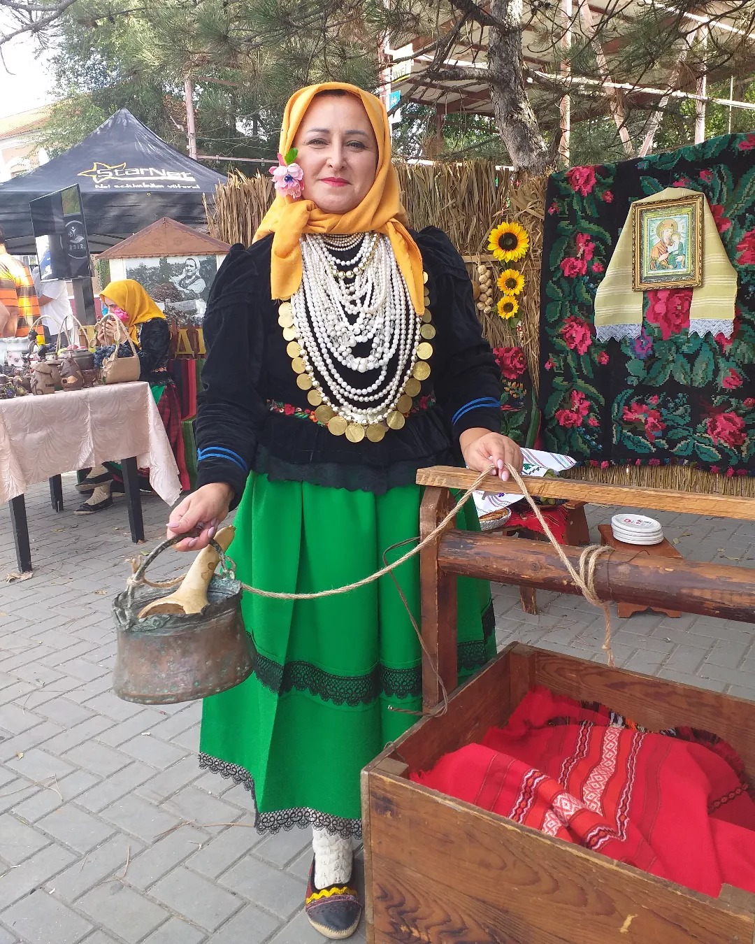 «Вот эти бусы называются алтени, по-русски это монисто. Их носили только девушки и молодые женщины, недавно вышедшие замуж. Эти алтени принадлежали моей прабабушке. Я думаю, им больше 100 лет. Они передаются в нашей семье из поколения в поколение. Моя мама передала их мне, теперь я передам их своей дочери. Она так же как и я, и как её бабушка, исполняет фольклор, но у неё и музыкальное образование есть по классу народной песни», — рассказывает Клавдия Ламбова.