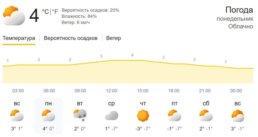 В Басарабяске в течение дня ожидается около +4 °C, ночью температура опустится до 0…+1 °C. Вероятность осадков невысокая — около 20%, поэтому снег или дождь маловероятны. Влажность воздуха составит примерно 84%, ветер слабый — до 6 км/ч, что сделает погоду относительно комфортной.