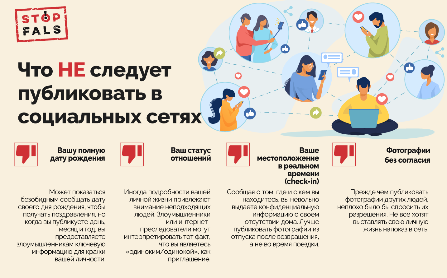 Проявляйте бдительность к содержанию публикаций. Проверяйте источник информации, прежде чем делиться ею. Распространение дезинформации — одна из самых больших проблем в интернете. Не делитесь интимными или деликатными фотографиями, даже в личных сообщениях, так как они могут быть захвачены или слиты.