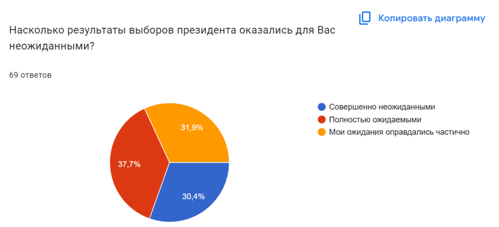 Согласно данным опроса, результаты выборов президента оказались полностью ожидаемыми почти для 38% респондентов. Частично ожидания оправдались у 32% участников опроса. Еще для чуть более 30% опрошенных результаты выборов президента оказались совершенно неожиданными.