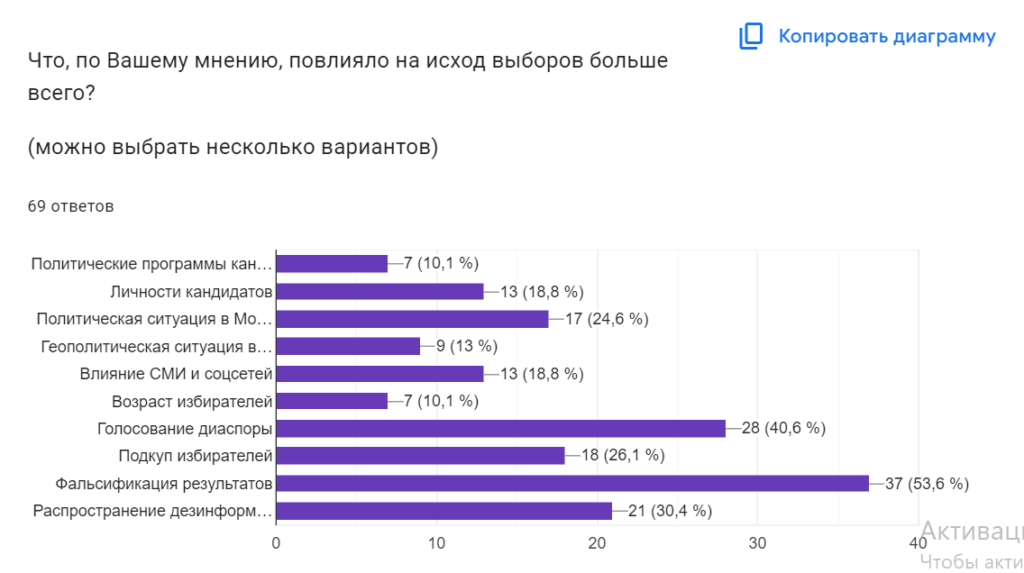 На вопрос, что, по вашему мнению, больше всего повлияло на исход выборов, около 54% опрошенных ответили «фальсификация результатов». Почти 41% отметили «голосование диаспоры». Чуть более 30% участников опроса считают, что на исход выборов повлияло распространение дезинформации. 26% ответили «подкуп избирателей», около 25% отметили «политическую ситуацию в Молдове». По 19% опрошенных думают, что на исход выборов повлияли личности кандидатов и влияние СМИ, и соцсетей. 13% ответили, что это геополитическая ситуация в мире. По 10% респондентов отметили, что на исход выборов повлияли политические программы кандидатов и возраст избирателей.