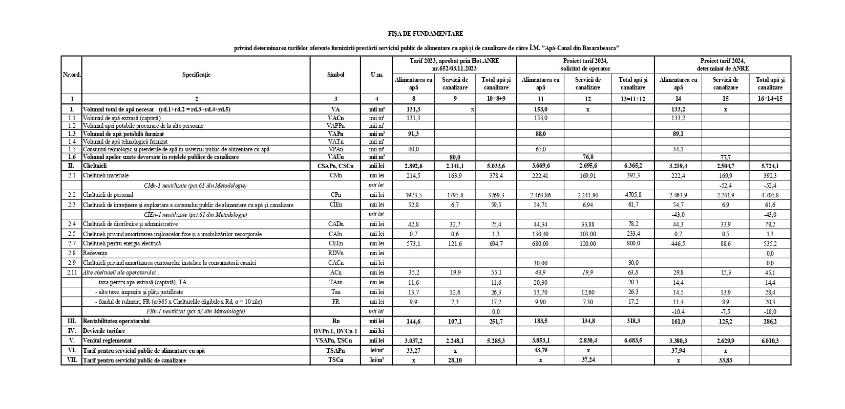 Обосновательный лист об определении тарифов, связанных с оказанием услуг общественного водоснабжения и канализации МП ”Apă-Canal” г. Басарабяска 2023-2024