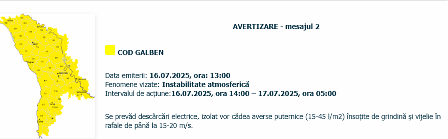 Государственная гидрометеослужба Молдовы выпустила желтый уровень метеоопасности на фоне ожидаемой атмосферной нестабильности по всей территории страны.