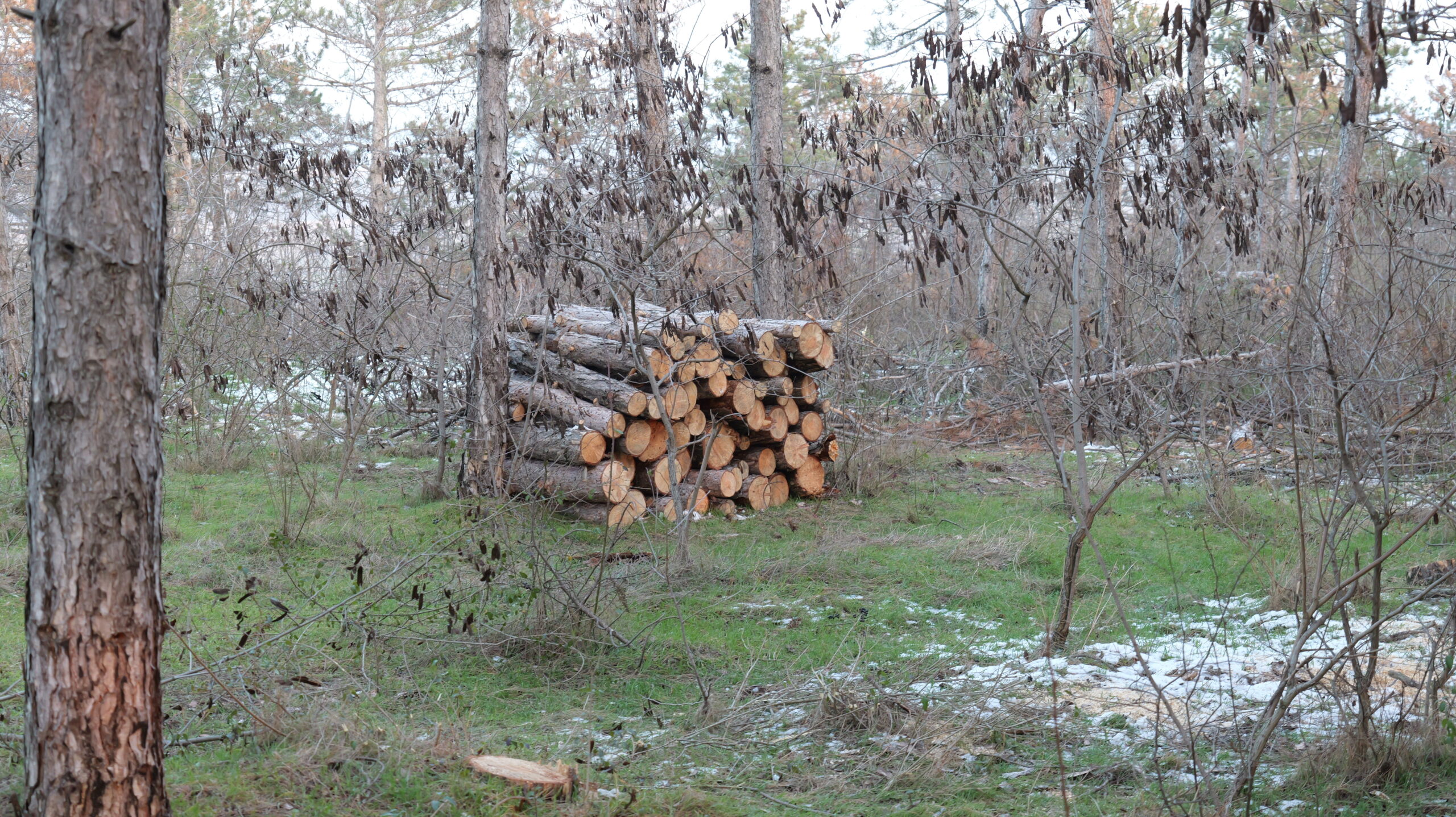 «Причина рубки сосен — жук короед. Если пораженные деревья не спилить, можно потерять всю лесополосу. Летом мы отметили пораженные деревья, но сейчас, когда начали их пилить, увидели, что соседние тоже поражены. Изначально планировалось спилить 68 кубометров, но из-за распространения жука, пришлось вырубить около 100 кубометров. По периметру лесополосы висят таблички, информирующие о работах, и контактные номера телефонов. Спиленные деревья лесхоз продает по цене, установленной государством», — отметил Павел Дюльгер.