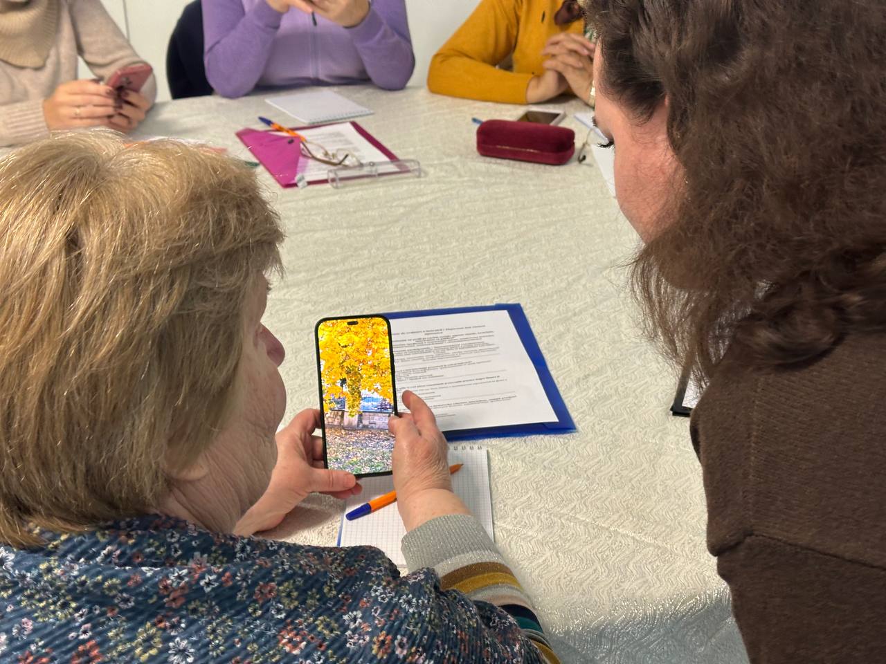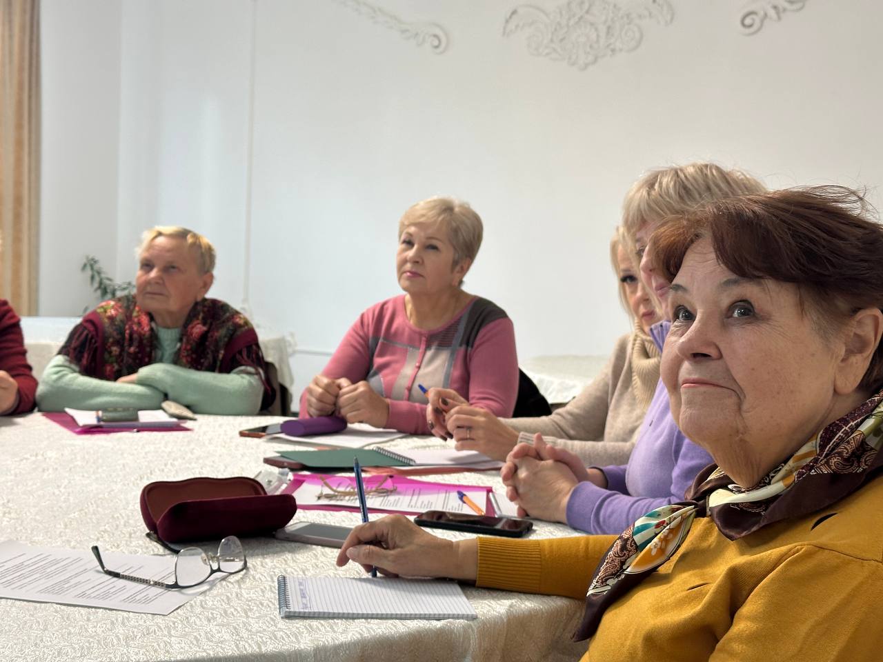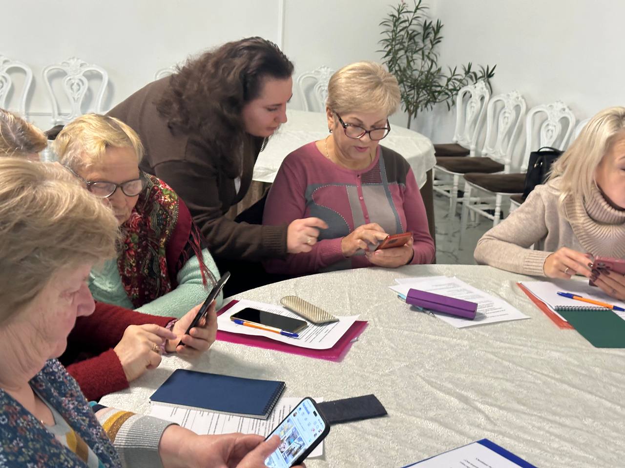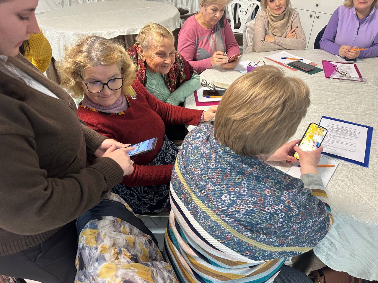 Заключительная часть тренинга была полностью практической. Женщины делали сторис, снимали портреты друг друга, пробовали записывать короткие видео и выполнять маленькие монтажные задания. Тренеры подходили к каждой участнице, помогали выбрать наиболее удачные кадры, подсказывали, как улучшить фотографию или стабилизировать видео. Несколько женщин впервые смогли самостоятельно оформить сторис с текстом, а другие попробовали снять мини-видеозарисовку о самой встрече. В зале царила атмосфера лёгкости, поддержки и совместного творчества.