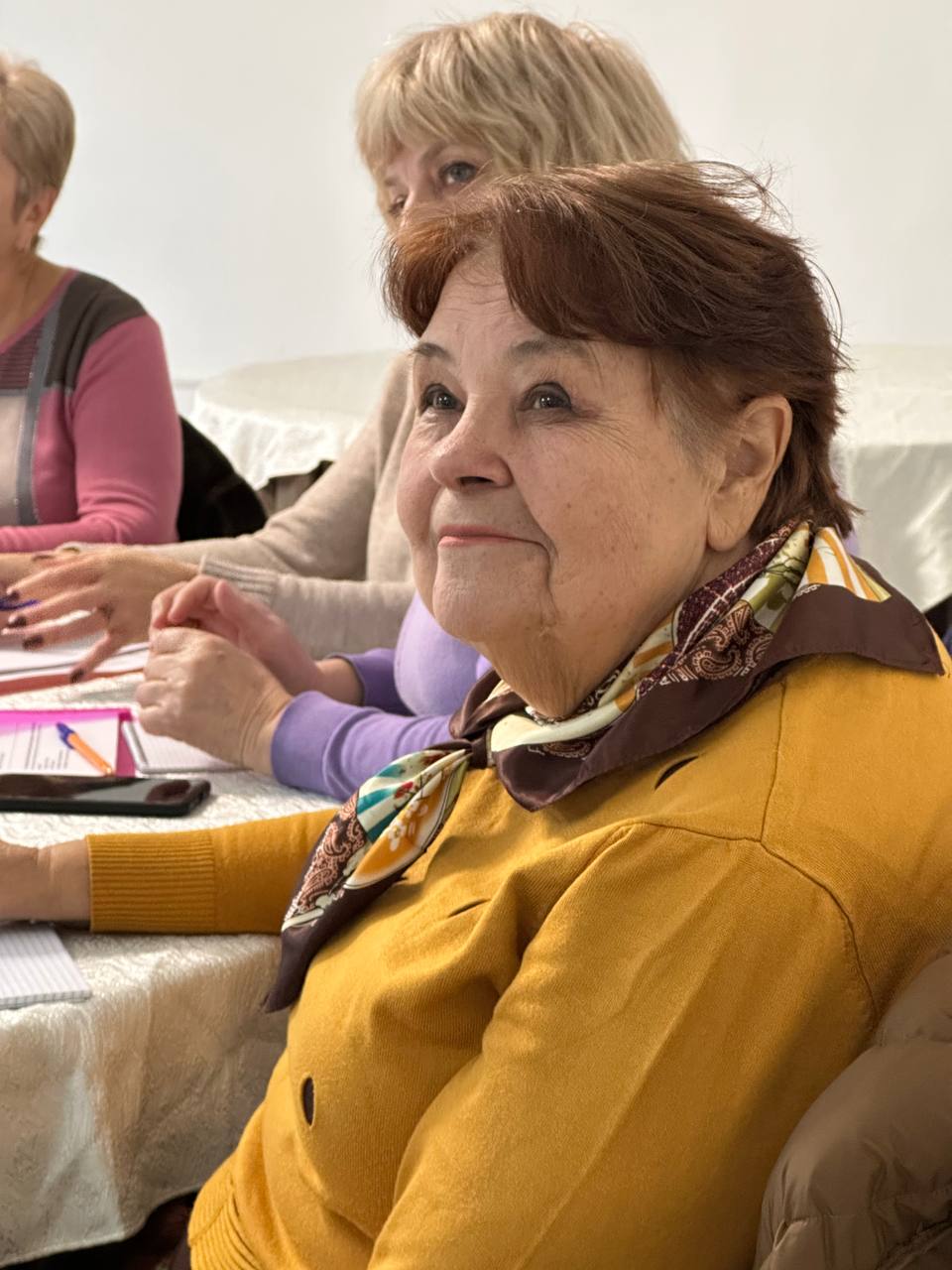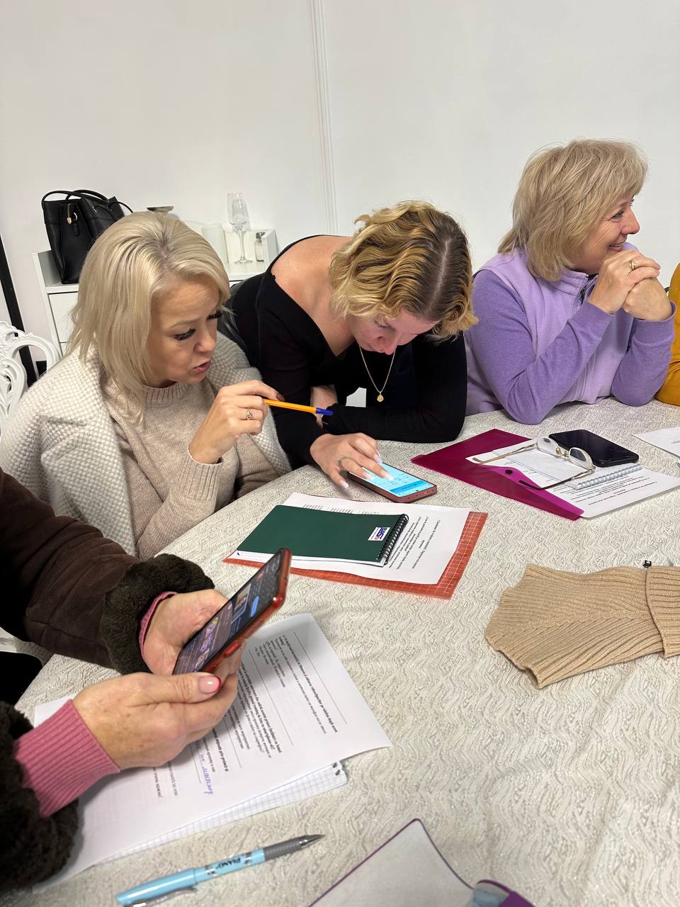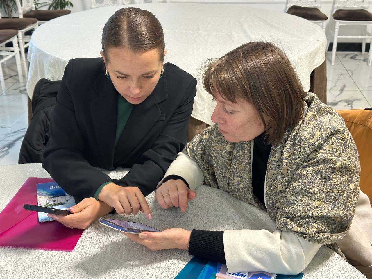 Заключительная часть тренинга была полностью практической. Женщины делали сторис, снимали портреты друг друга, пробовали записывать короткие видео и выполнять маленькие монтажные задания. Тренеры подходили к каждой участнице, помогали выбрать наиболее удачные кадры, подсказывали, как улучшить фотографию или стабилизировать видео. Несколько женщин впервые смогли самостоятельно оформить сторис с текстом, а другие попробовали снять мини-видеозарисовку о самой встрече. В зале царила атмосфера лёгкости, поддержки и совместного творчества.