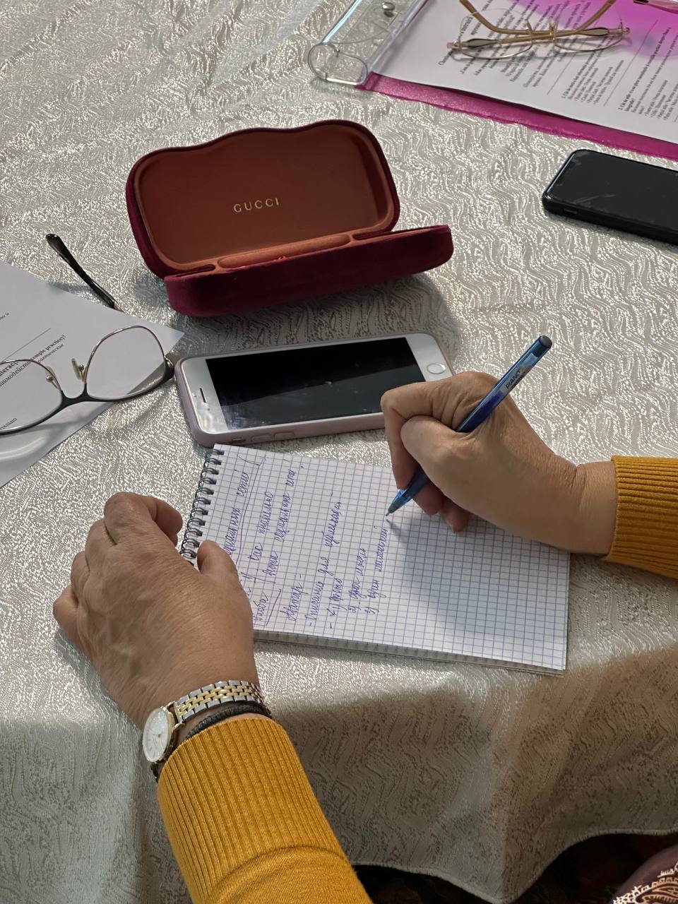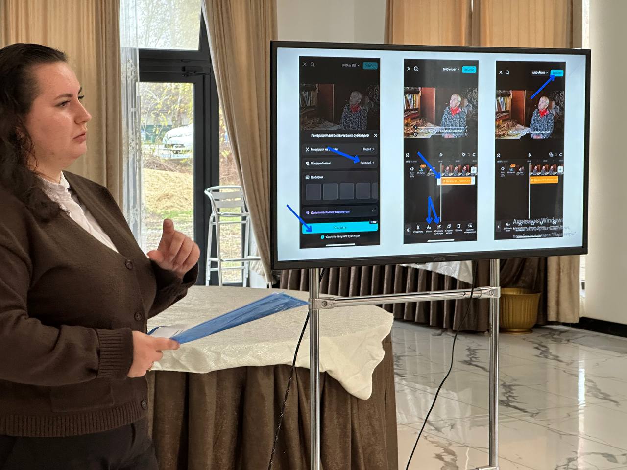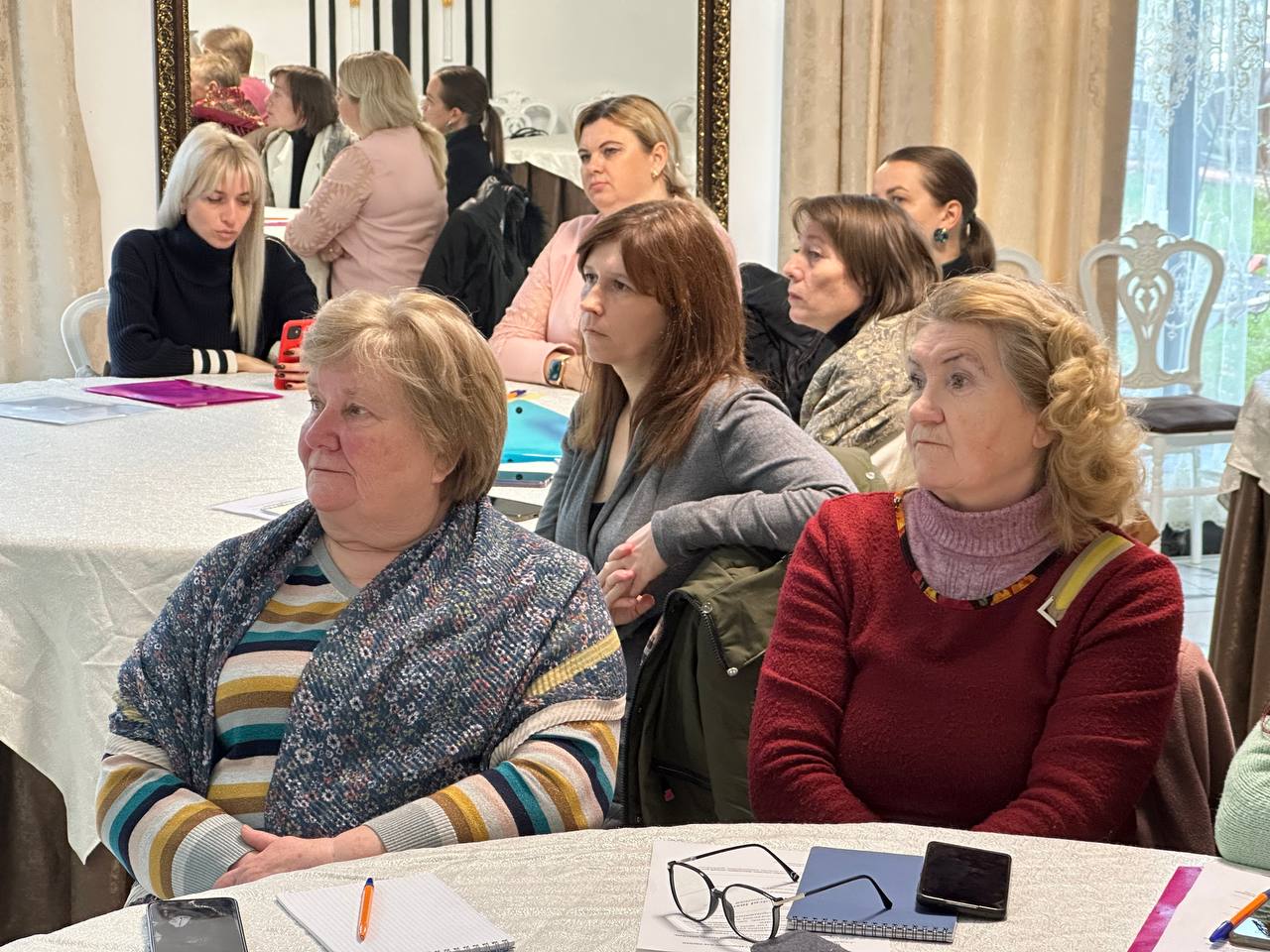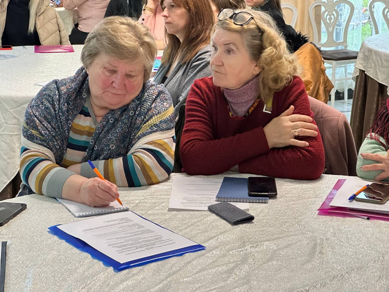 Заключительная часть тренинга была полностью практической. Женщины делали сторис, снимали портреты друг друга, пробовали записывать короткие видео и выполнять маленькие монтажные задания. Тренеры подходили к каждой участнице, помогали выбрать наиболее удачные кадры, подсказывали, как улучшить фотографию или стабилизировать видео. Несколько женщин впервые смогли самостоятельно оформить сторис с текстом, а другие попробовали снять мини-видеозарисовку о самой встрече. В зале царила атмосфера лёгкости, поддержки и совместного творчества.
