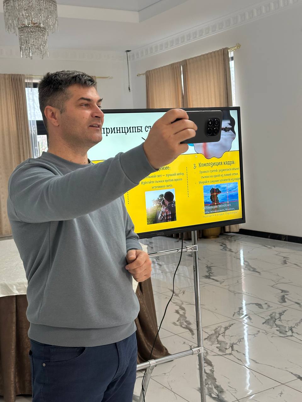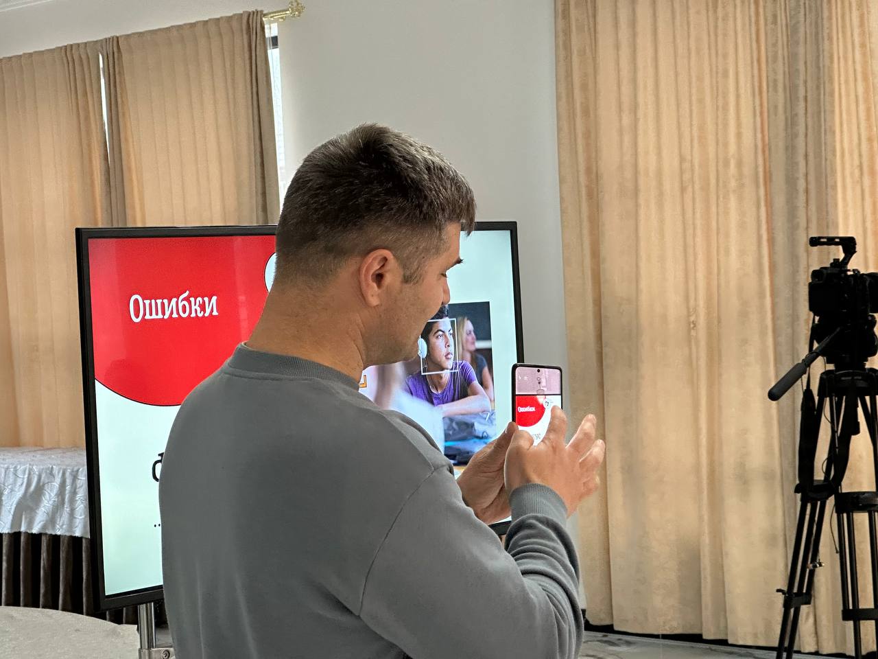 После теоретической части к работе присоединился оператор BAStv Евгений Гургуров. Он рассказал об основах мобильной фото- и видеосъёмки: как найти правильное освещение, выбрать удачный ракурс, удерживать телефон ровно, использовать настройки камеры и выстраивать композицию кадра. Для многих стало открытием, что, зная лишь несколько простых приёмов, можно получить совершенно иное качество снимков, сделанных на обычный телефон, по сравнению с их прежними фотографиями.